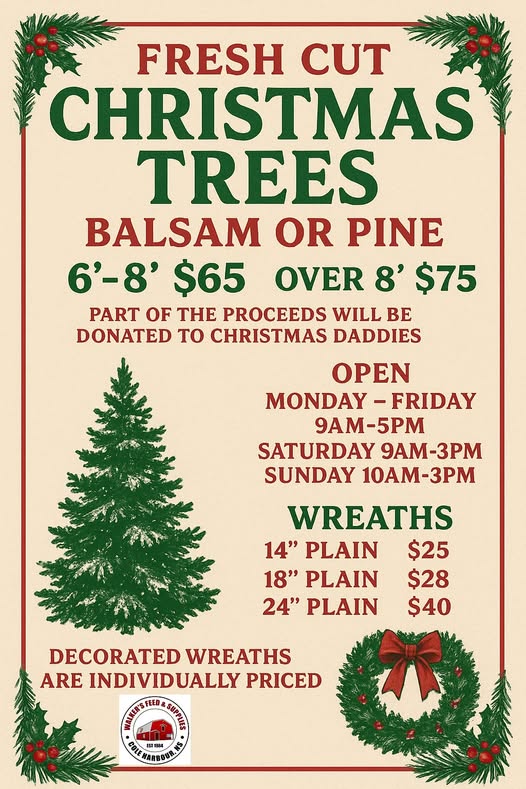 Fresh Cut Trees at Walker’s Feed & Supplies – Dartmouth, NSWalker’s Livestock Feed & Supplies Are always proud to donate part of the proceeds to Christmas Daddies! Visit their Facebook page or website 1397 Cole Harbour Road Dartmouth NS B2V 1N5 Phone: (902) 435-5561 https://www.christmasdaddies.org/wp-content/uploads/2025/10/WALKERS-logo.jpg 112 303 Roxanne Robinson /wp-content/uploads/2016/05/Christmas-Daddies.png Roxanne Robinson2025-10-08 11:00:432025-11-25 18:22:07Fresh Cut Trees at Walker’s Feed & Supplies – Dartmouth, NS